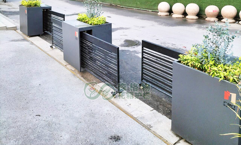 安全与细节优化:护栏横杆采用防翻越设计,花箱边角做钝化处理,降低安全隐患;整体色调采用深灰色,与商业建筑及施工围挡风格协调统一。