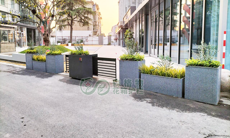 花箱与护栏一体化设计:花箱采用镀锌钢板材质,表面经喷涂处理,耐候性强;搭配本地适生绿植,与周边环境自然融合,有效柔化硬质界面,提升街区景观效果。