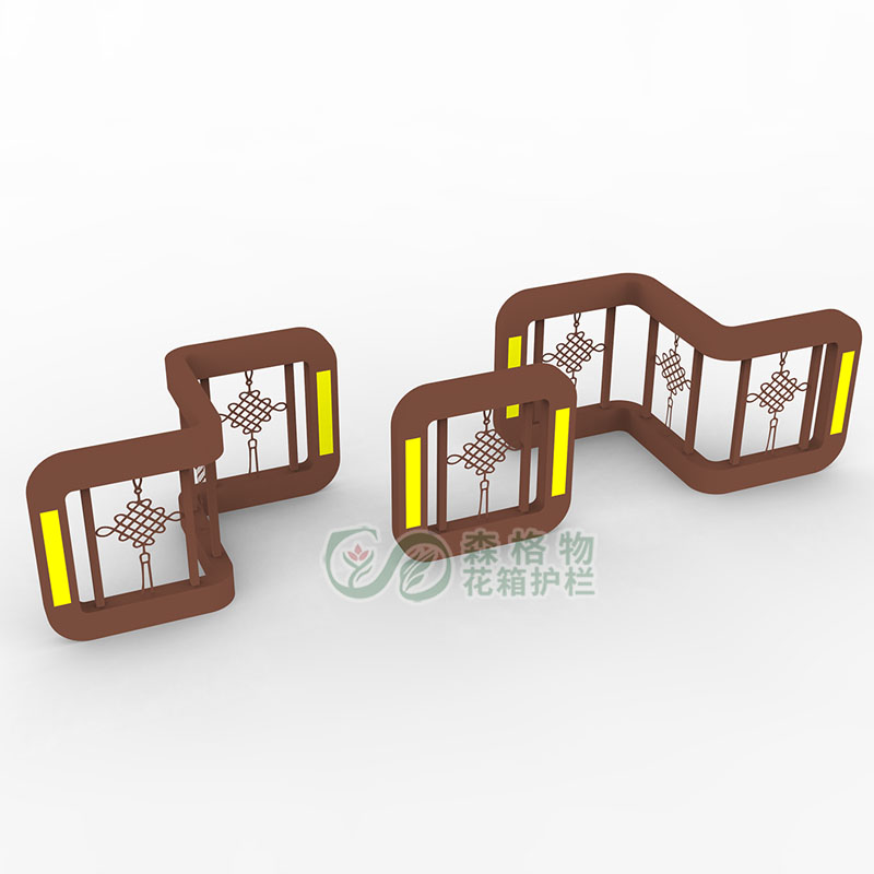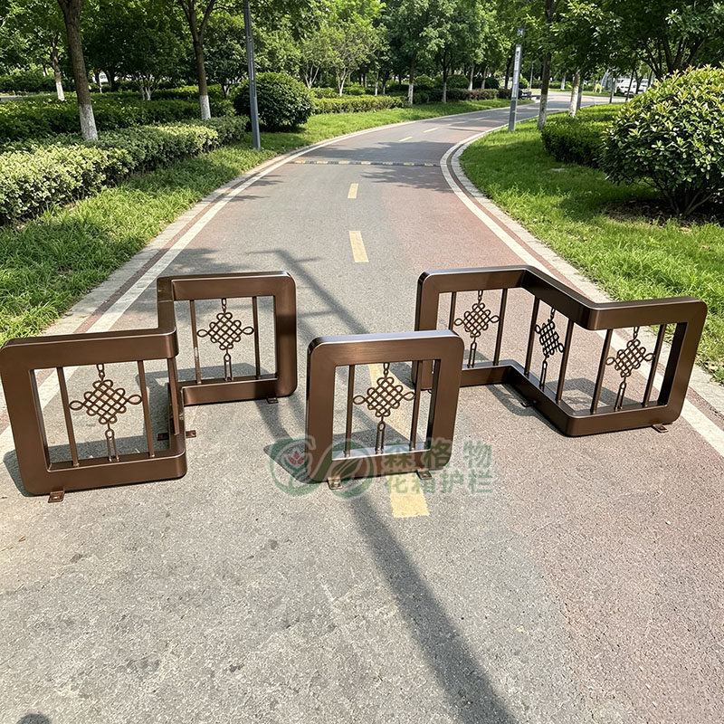 1.造型设计:护栏主体采用框架式结构,线条流畅规整,框架内侧悬挂镂空中国结造型装饰件,细节精致,中式氛围感拉满。整体造型可灵活组合,适配直线路段、转角区域等不同场景,满足多样化的道路隔离需求。