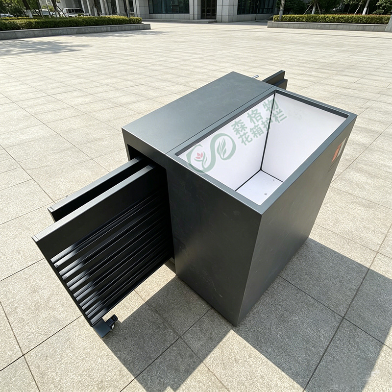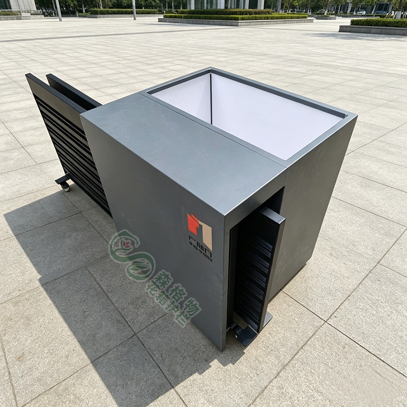 花箱主体:采用方正的箱体造型,边角做平滑过渡处理,避免尖锐磕碰;箱体表面为哑光喷涂工艺,质感细腻,不易留指纹与划痕;箱体侧面预留品牌标识位,可定制专属标识,适配不同场景的品牌展示需求;箱体内部为白色防水内胆,便于绿植种植与清洁维护。